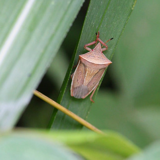 エビイロカメムシの成虫もいました。成虫は厚みのあるごく普通のカメムシスタイルです。