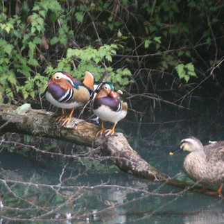 なんとオシドリの雄が2羽、飛来していました。オシドリは例年、ドングリの落果時期に