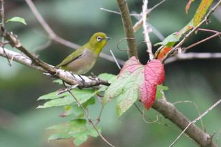 水場へ降りる途中で小鳥が伝ってくる枝に、鮮やかに紅葉したエビヅルが絡んでいました。