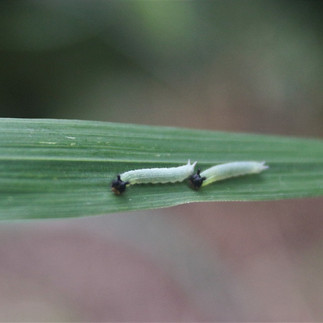 例年、ヨシやススキの葉っぱで見かけることの多い、クロコノマチョウの幼虫です。