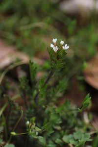春のかなり早い時期から花を咲かせています。小さいながらも花びらが4枚、細長い棒状の果実、切れ込んだ葉など