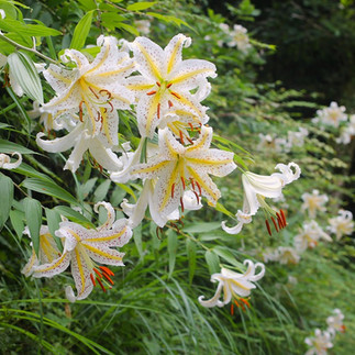 現地に着くと早速、見事なヤマユリの群落が出迎えてくれました。斜面に垂れ下がるように