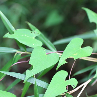 おまけ。ヤマノイモの葉に穴あけパンチのような不思議な模様。バラハキリバチがかじり