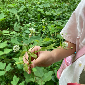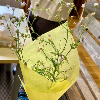 芝生広場に刈り残された雑草のお花畑から、好きな草花を摘んできてブーケを製作します。
